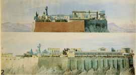 | Grünflächen. Die Südansicht stellt die schattenspendenden Kolonnaden und die dahinterliegenden Gemächer des Königspaares und die große Empfangshalle dar. Den südlichsten Punkt bildet ein Rundturm, in dem sich der Salon der Königin und darunter eine Badehalle befinden.
