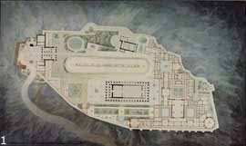 | Schinkel ein Märchenschloß von erstaunlichen Ausmaß. Der rautenörmige Grundriß zeigt in der Mitte eine lange Rennbahn, flankiert von dem Parthenontempel mit überragender Statue der Pallas Athene, der Schutzgöttin Athens auf der einen Seite und dem Erechtheion-Tempel auf der anderen Seite. Abgeschlossen wird die Anlage zur Rechten und Linken durch kunstvoll gestaltete Rasenflächen, teils mit Springbrunnen. An die Stirnseiten der Rennbahn schließt sich im Westen die Auffahrtsalle mit einzigem Zugang durch die Propyläen an. Im Osten beginnen die zahlreichen Wohnbauten, aufgelockert durch kleine | |