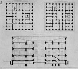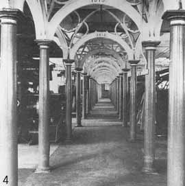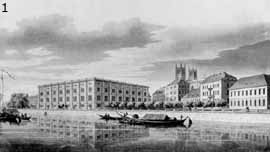 1 Schinkel, Bauakademie, schwarze Tusche 1831, 43 x 65 cm 2 Zeichnung nach Schinkel für den Kupferstich seiner Sammlung Architektonischer Entwürfe - Grundrisse und Schnitt, Feder und Tusche 1833, 56 x 42 cm 3 Bauakademie, Ansicht von Norden 4 Stanley Mill bei Stroud. 1813 errichtet, von Schinkel am 26. Juli 1826 besichtigt. Innenraum mit Kappengewölbe auf Eisenstützen |