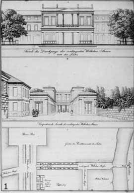 | Dieser Zweckbau Schinkels entstand als neu geschaffene Verbindung der Straße Unter den Linden mit dem Schiffbauerdamm durch die Wilhelmstraße, nahe dem Brandenburger Tor. Das Haus Unter den Linden 76. an der Schnittstelle zur Wilhelmstraße baute Schinkel zum Kopfbau der Ladenstraße um. Dieses zweigeschossige Haus wurde im Erdgeschoß aufgebrochen zu einer von sechs Säulenpaaren flankierten Durchfahrt mit seitlichen Durchgängen für Fußgänger. Die repräsentative Fassade zu den "Linden", sollte durch Eleganz anziehen: Sie wurde im Erdgeschoß von der breiten Durchfahrt mit dorischen Säulen und Pilastern sowie im Obergeschoß von einem Frontspiz mit Dreiecksgiebel dominiert, der durch vier korinthische Säulen gebildet wurde. Die Attika war mit vier großen Statuen in der Pfeilerflucht bekrönt. Auf der Seite zur Wilhelmstraße war der Querbau, in dessen Obergeschoß ein Ausstellungssaal lag, durch hohe korinthische Pfeiler gegliedert. Dem Bau waren beidseitig der Wilhelmstraße zwei Flügel angefügt, die eigentliche Ladenstraße, erst zweigeschossig mit Verwaltungsräumen im Obergeschoß, dann eingeschossig. Die Reihe der je acht Läden entlang der Wilhelmstraße begann im Anschluss an den Querbau.