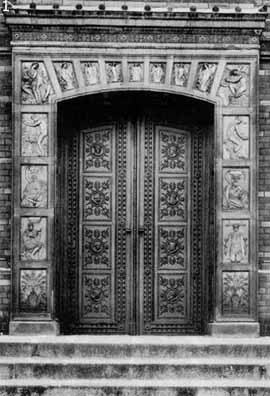 | Nur ein geringer Teil des an der Bauakademie angebrachten Bauschmuckes hat sich über Krieg und Abriß hinweg bis heute erhalten können. Das ehemalige linke Portal, das genauso wie die Fensterbrüstungen und Fensterbögen mit Terrakottareliefs verziert worden war, bildet jetzt den Eingang zur Schinkel-Klause. Die rechteckigen Bildtafeln links und rechts der schweren, aus Eisen gegossenen Eingangstüren reihen sich ein in den Gesamtkontext des Bauakademie-Bildprogramms, das, die Nutzung des Gebäudes als Bauschule sinnbildlich zum Ausdruck bringend, den Aufstieg und den Niedergang der klassischen Baukunst thematisierte. Über den beiden untersten Reliefplatten mit Akanthusgewächsen sieht man von links nach rechts: Herakles vor einer dorischen Säule, den dorischen Stil verkörpernd, daneben die Darstellung der ägyptischen Architektur. Daran schließen sich zwei kniende Mädchengestalten an, die Körbe auf ihren Köpfen tragen, links das korinthische, rechts das ionische Kapitell symbolisierend. Die linke Platte der vierten Reihe erzählt die Erfindung des korinthischen Kapitells durch Kallimachos, die rechte ist aus dem rechten Portal ergänzt. Den flach gebogenen Türsturz zieren geflügelte Genien mit Akanthusblättern, gerahmt von Orpheus und Amphion, die mit ihrer Musik die Steine in Bewegung versetzen konnten. Die Medaillons in den acht Feldern der Türflügel nehmen Bildnisköpfe großer Architekten und Künstler auf.